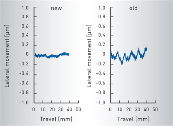 得益于NANOTOL®技术,Röders公司将其RPT机床直线导轨的精度与运行性能提升至全新高度。导轨的运动公差被控制在极微小的范围内,这些公差对加工结果已不再产生任何影响——诸如刀具运行同心度等其他参数如今发挥着更重要的作用。如图所示,采用NANOTOL®技术的新型导轨系统相较传统技术实现了质的飞跃。